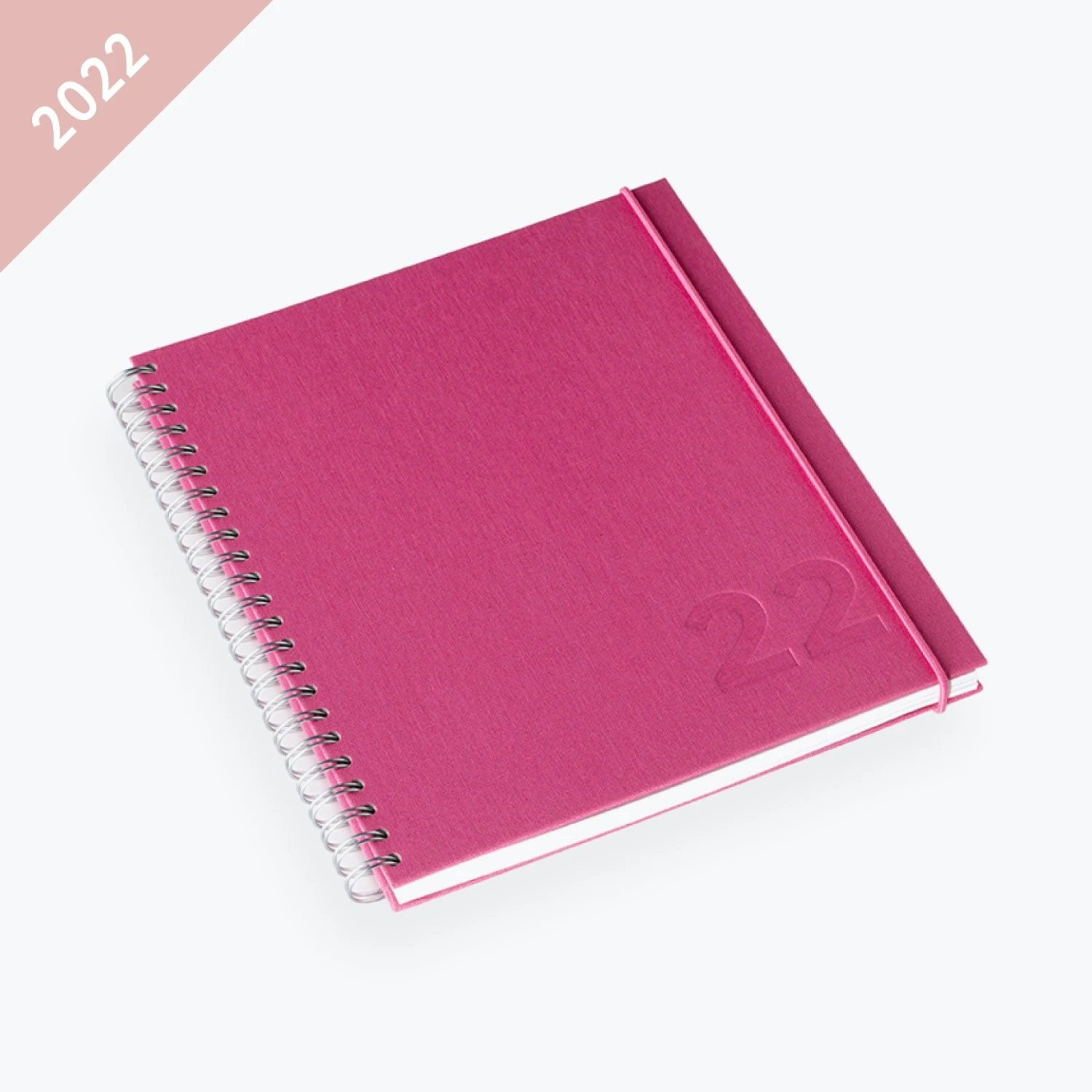 Get organised for 2022 with the pink, wire-o Bookbinders Design diary. The regular sized, hard cover features a week per double page, as well as a monthly overview. The number 22 is blind debossed on the bottom right hand corner, while the elastic closure keeps the diary shut and a black ribbon makes it easy to bookmark pages.