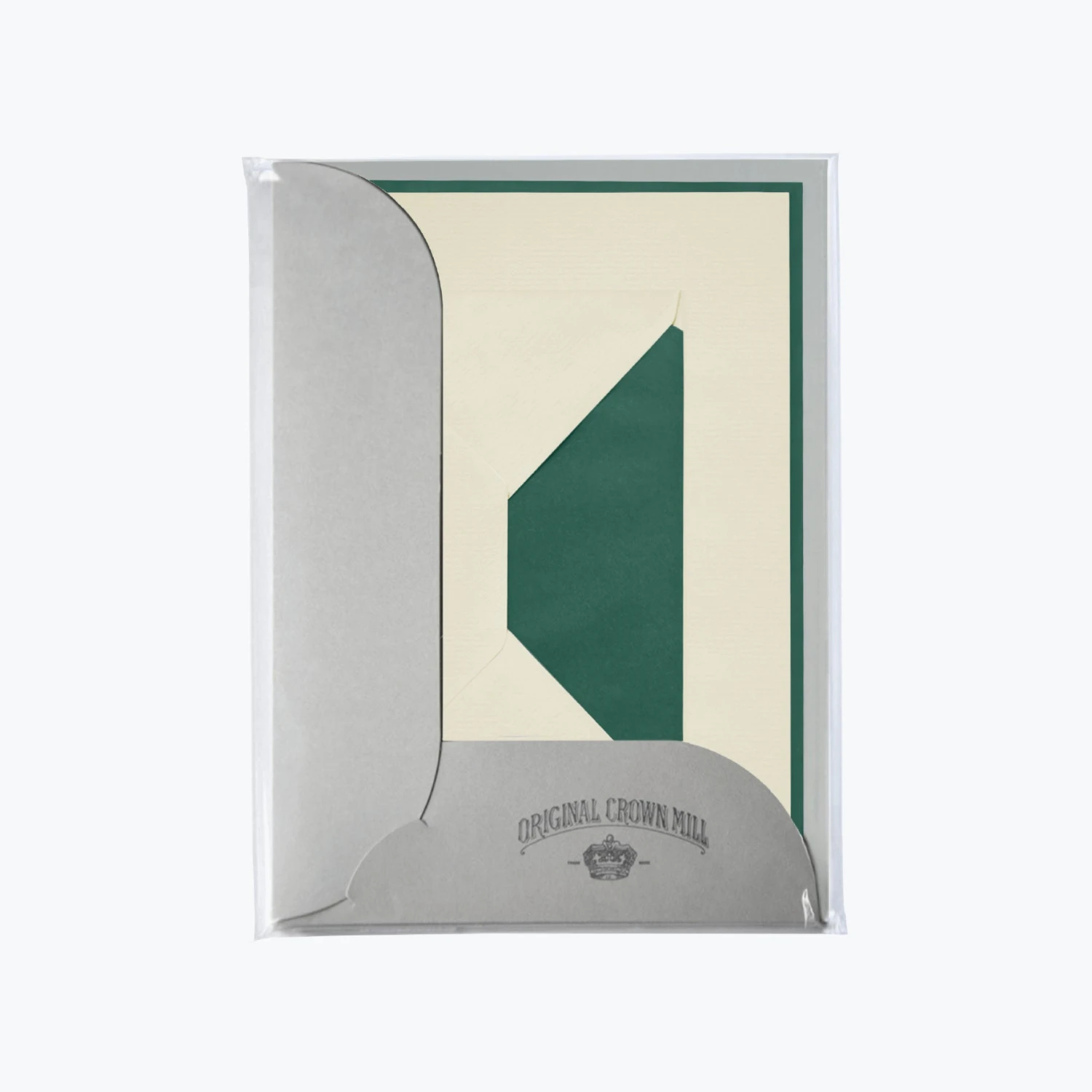 This Crown Mill letter set includes 8 flat sheets of cream, laid paper with a green border and 8 matching C6 envelopes that are tissue lined. The set comes in a cardboard compendium, making it easy to store or take on your adventures.
