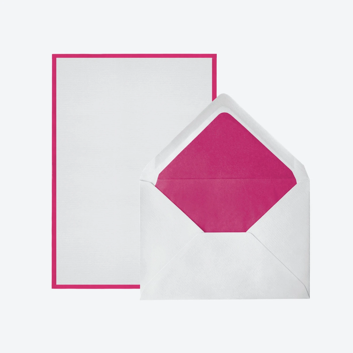 Made in Belgium. this Crown Mill letter set includes 25 flat sheets of white, laid paper with a pink border and 25 matching C6 envelopes that are tissue lined. The set comes in a sturdy, silver presentation box.