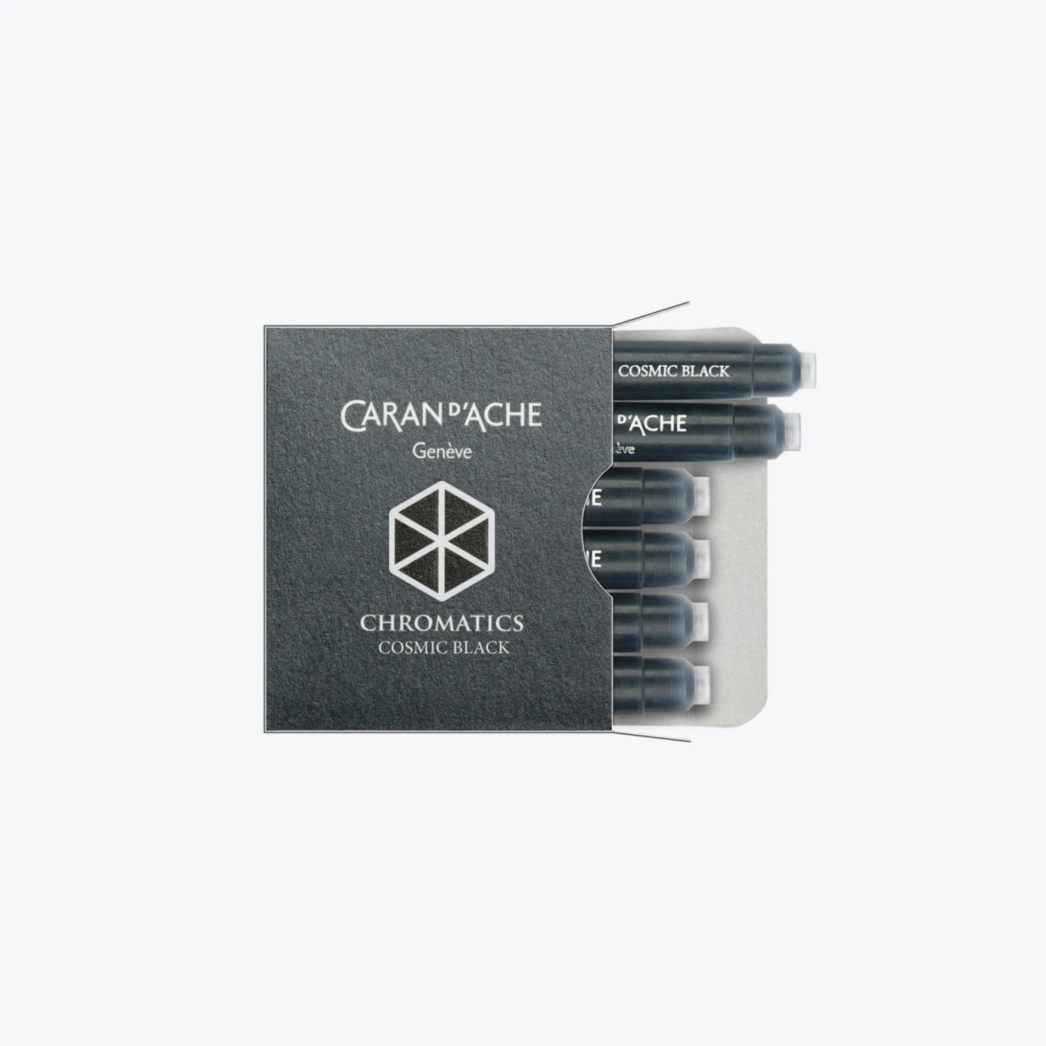 This pack contains 6 international ink cartridges filled with cosmic black ink. Can be used as a refill for the Caran d’Ache 849 fountain pens or any other brands that take international cartridges.