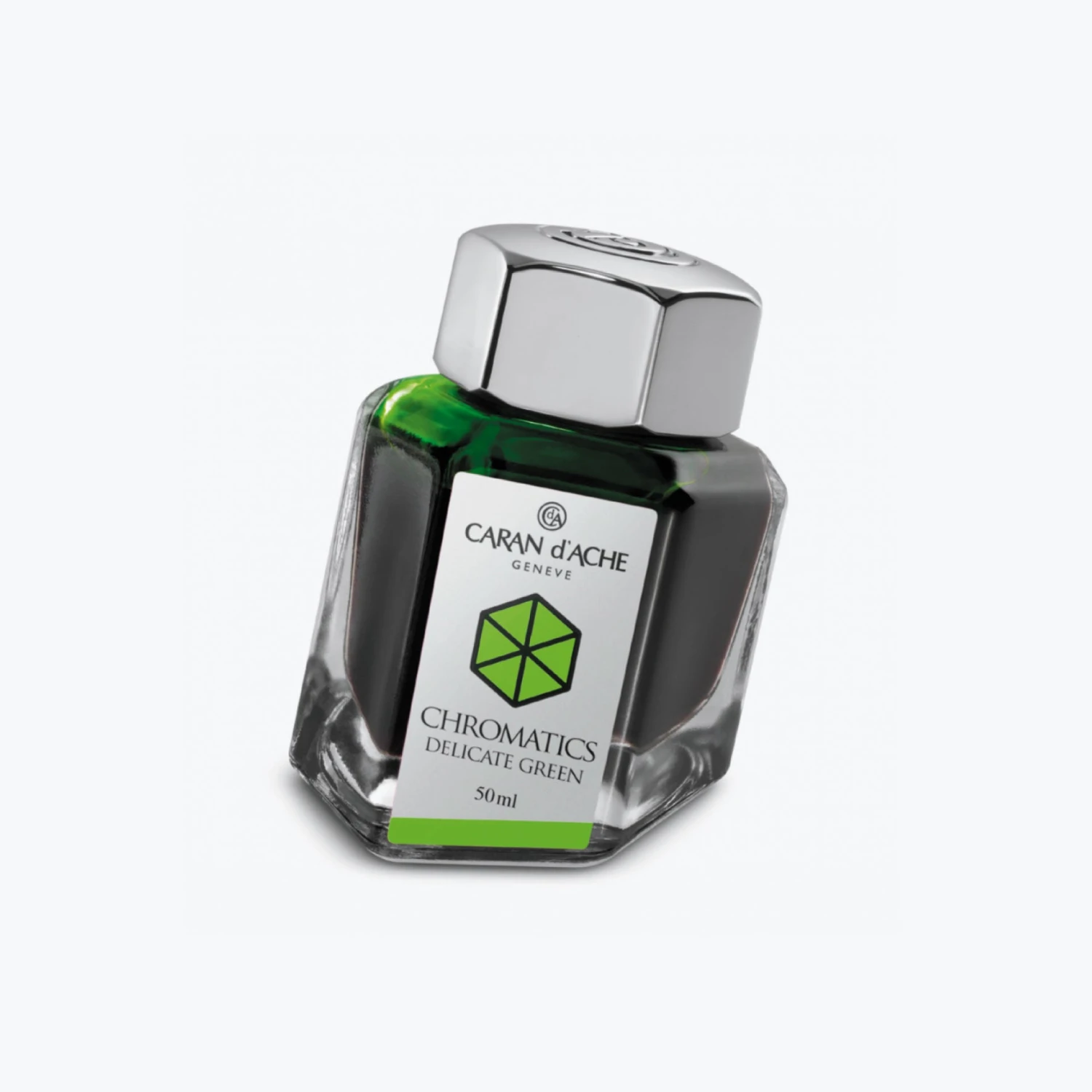 The delicate green Caran d’Ache Chromatics fountain pen ink range includes an assortment of colours inspired by the prisms, giving the words a uniquely vibrant style. The Chromatics ink is moderately saturated and exhibits strong shading.Â