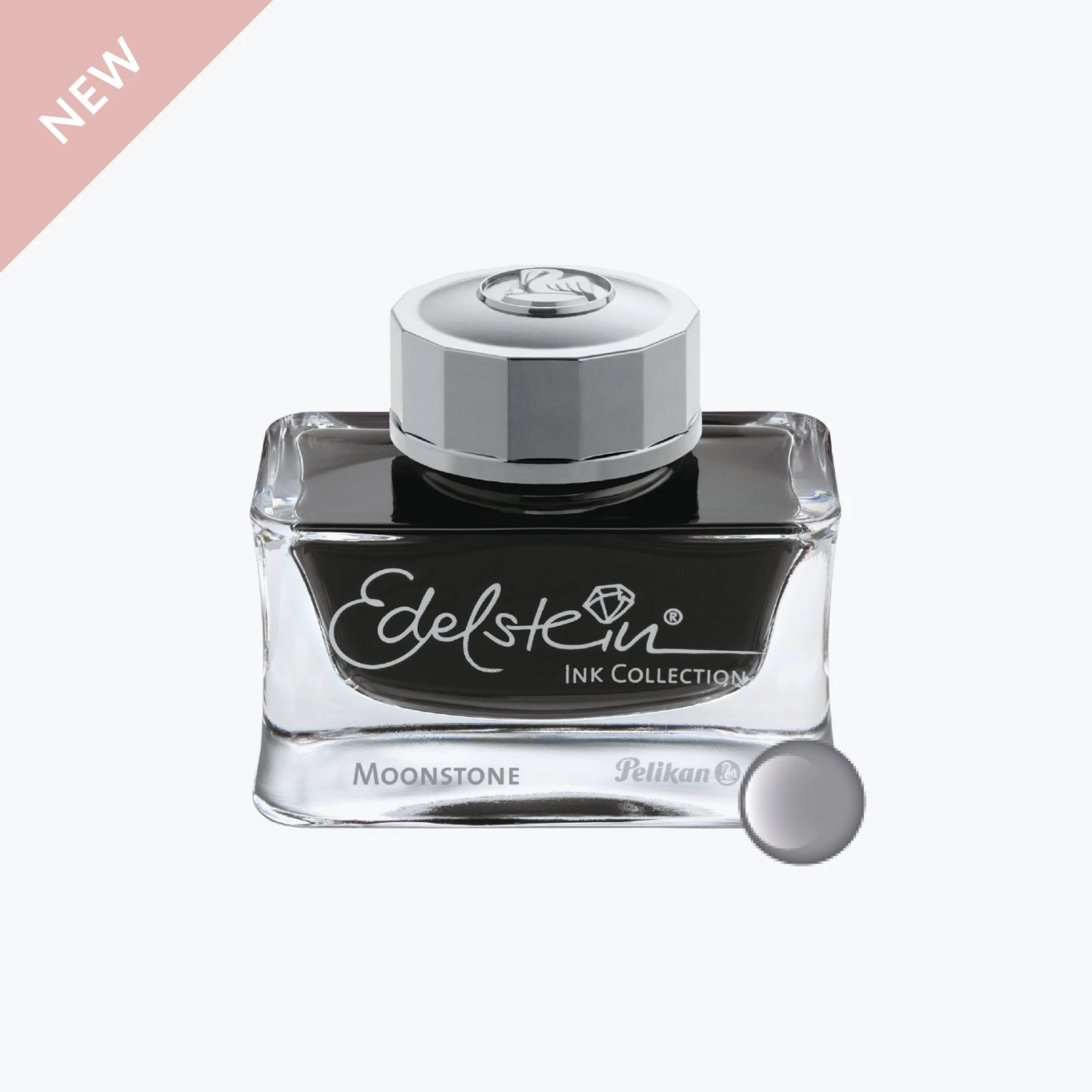 Moonstone Edelstein fountain pen ink by Pelikan. This grey fountain pen ink is set in a beautiful 50ml inkwell glass bottle. This is Pelikan’s 2020 Ink of the Year and will be available in limited quantities.