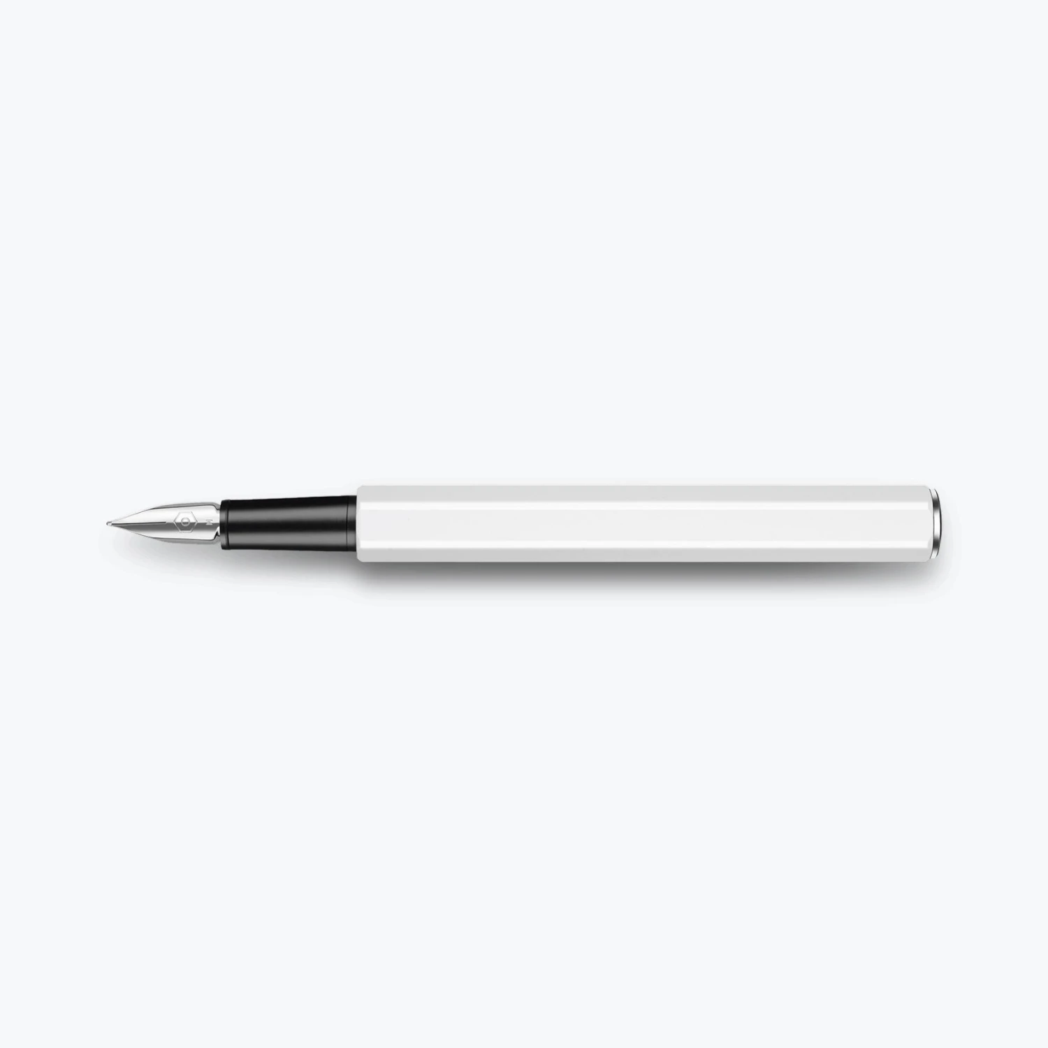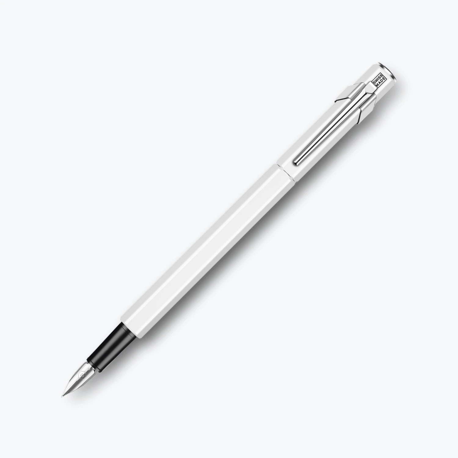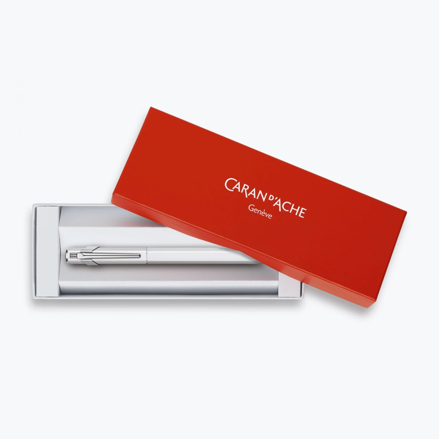 The white Caran d’Ache 849 fountain pen is a contemporary take on a traditional writing instrument. It is Swiss made and features a hexagonal, lightweight yet robust aluminium body with a click in cap, with the Caran d’Ache isotype engraved on the button.Â