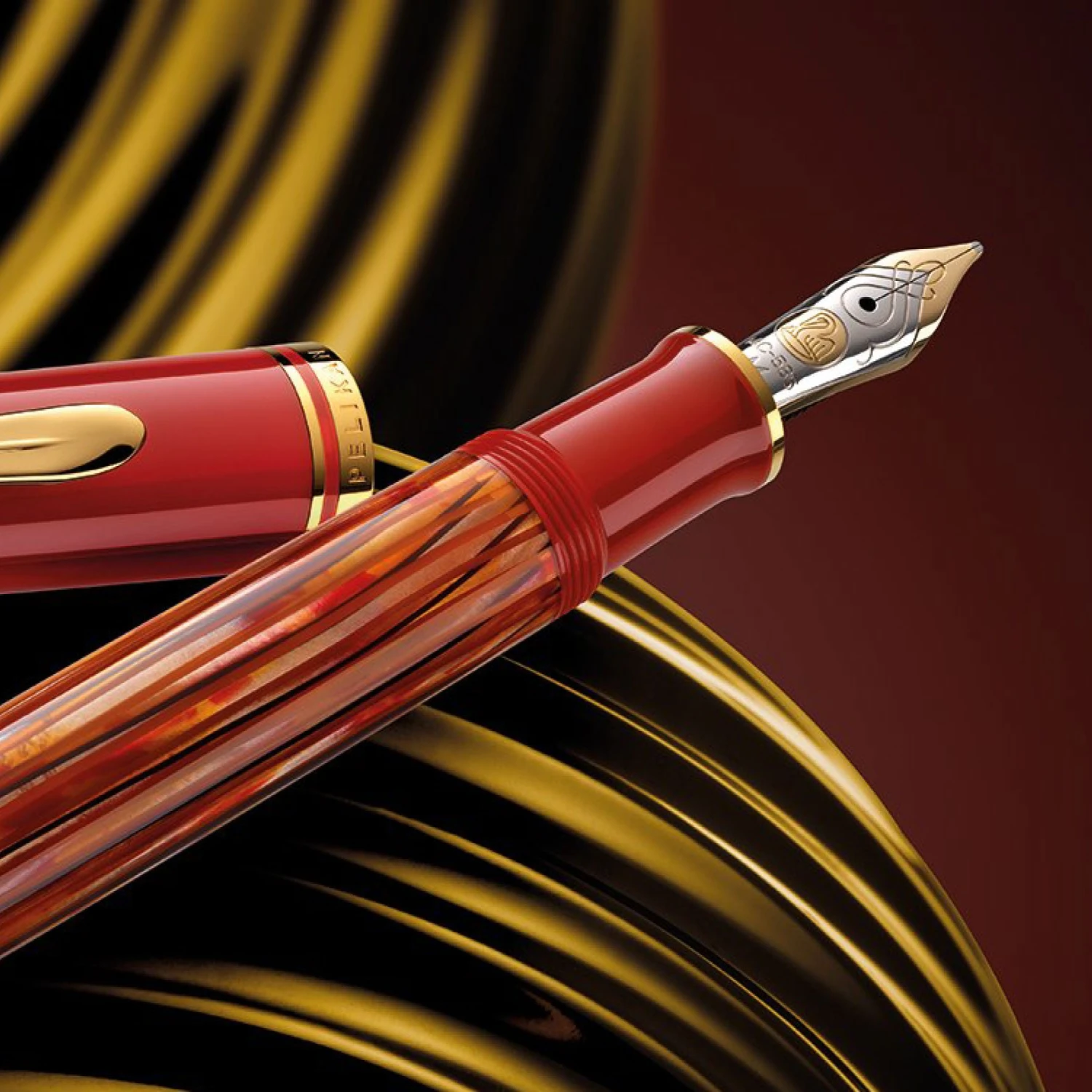 Designed with comfort and functionality in mind, the Pelikan M600 Tortoiseshell Red is unlike other fountain pens. It is created using traditional Pelikan craftsmanship and features a red and orange striped cellulose acetate barrel.