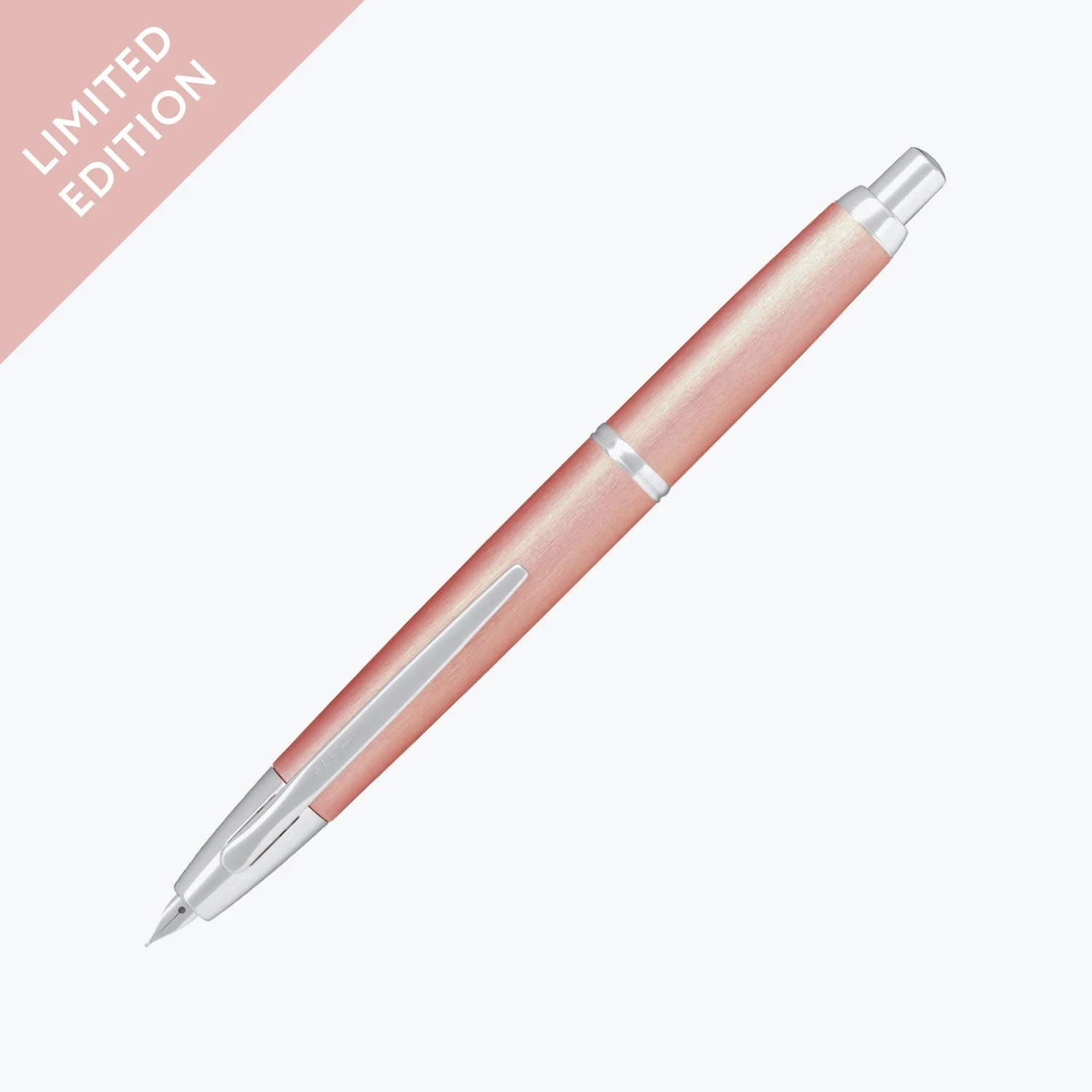 Champagne Pink Decimo 20 Colors Volume 3 by Pilot. New Alumite Technology (anodized aluminium), provides increased resistance to corrosion and wear, with better colour/paint adhesion. Alumite Technology, coupled with hairline techniques creates a new tactile texture to the barrel. It comes in a gift box, with a Pilot Converter-40 inside the pen and a black ink cartridge.