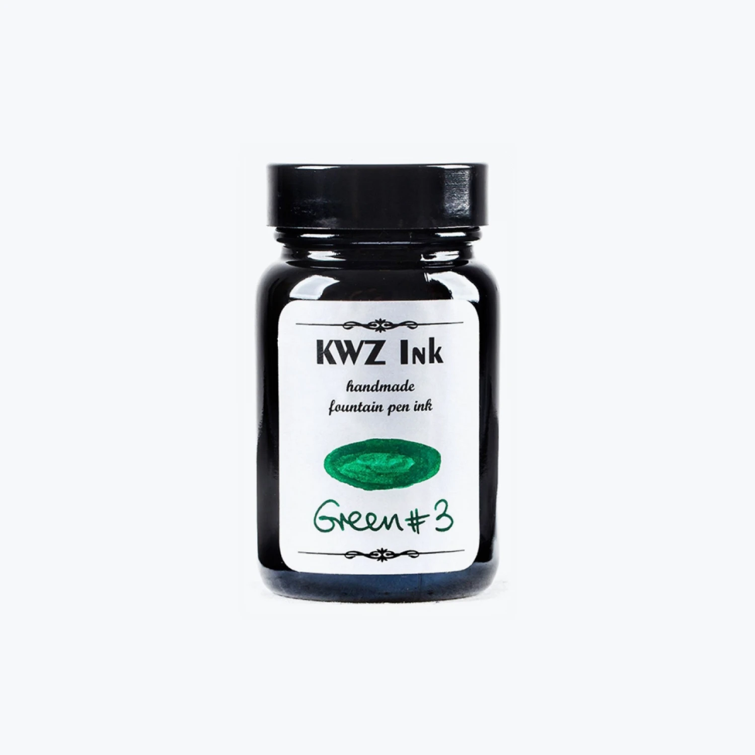 The Green #3 handmade bottle contains 60mL, while the hand-written label is a defining feature of KWZ. They are a remarkable find for those who appreciate colour intensity and wet flowing fountain pen inks for a great writing experience.
