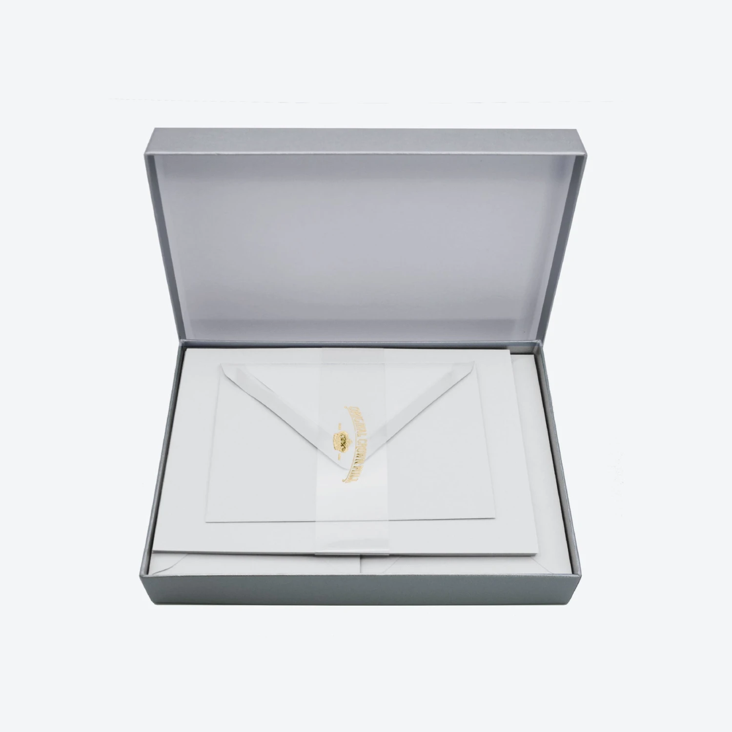 Made in Belgium. this Crown Mill letter set includes 25 flat sheets of white, laid paper with a white border and 25 matching C6 envelopes that are tissue lined. The set comes in a sturdy, silver presentation box.