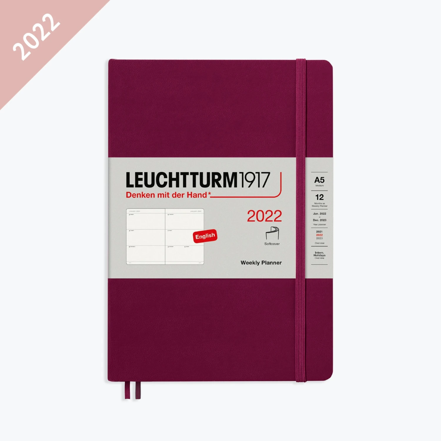 The A5 port red Leuchtturm1917 weekly planner diary is a simple yet functional companion for 2022. It features one week per double page spread, with enough space for several lines for every day of the week.