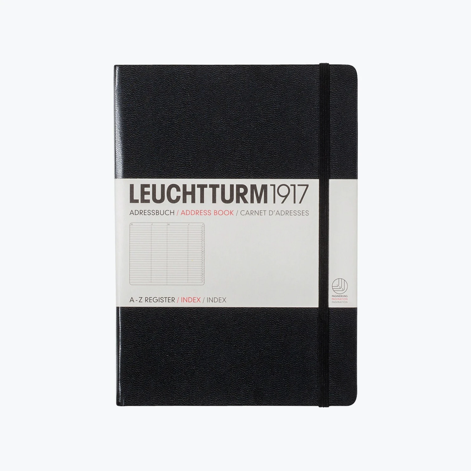 The famous Lauchtturm1917 address book features 104 pages of A-Z tabs (1 tab per letter, 4 pages per letter). The Leuchtturm1917 address book is thread-bound so it remains flat when open, while an elastic band holds it closed when not in use. It comes with a blank table of contents, stickers for labelling and archiving, a gusseted pocket on the back cover and a page marker.Â