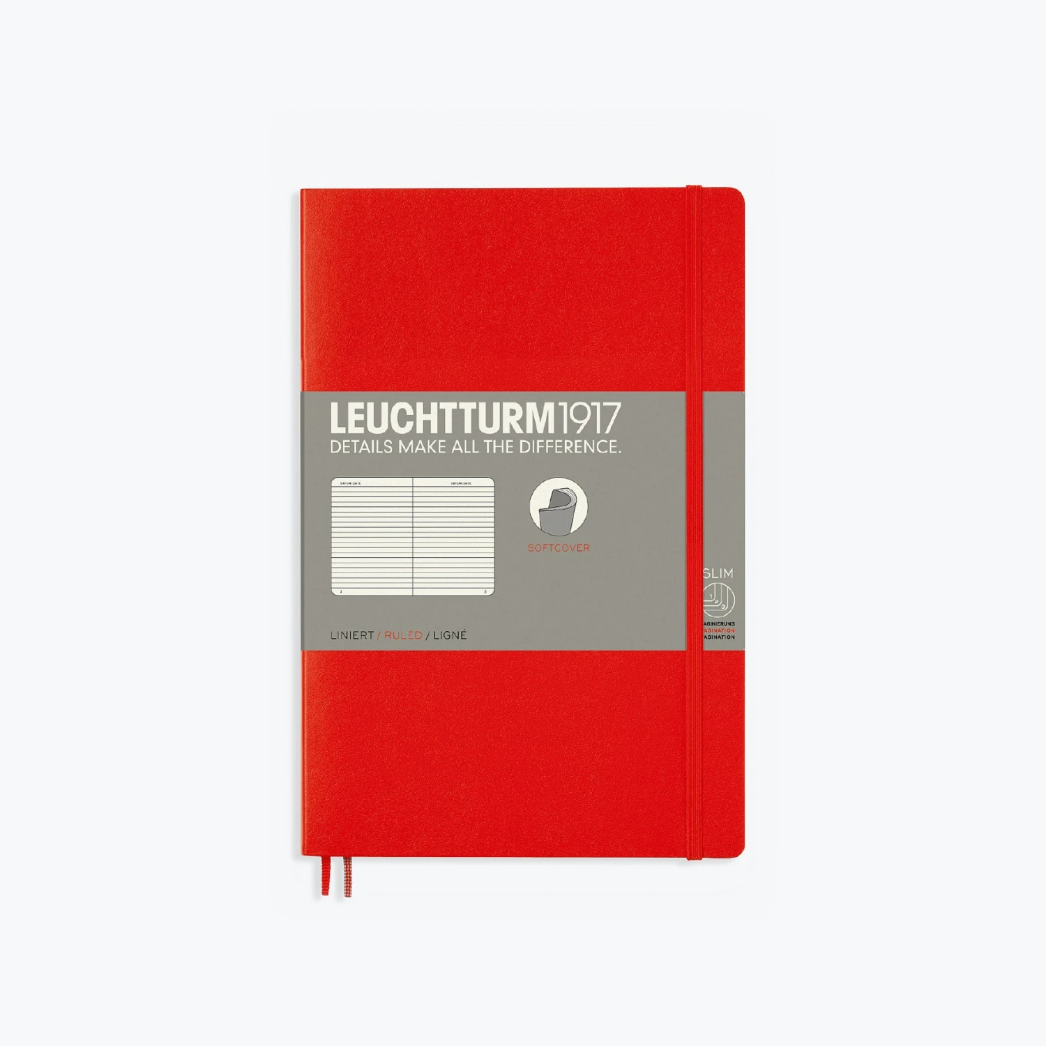 The red Leuchtturm1917 B6+ is a simple yet sophisticated softcover notebook, making it an ideal companion for all walks of life. Softcover notebooks are lighter and more flexible but have the same great features.Â