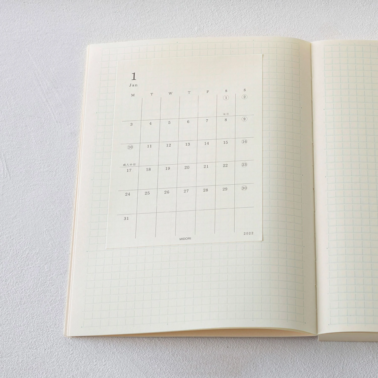 The Midori 2022 Diary Sticker [S] allows you to stay organised using your existing notebook. For example, you can attach a month-long calendar sticker to the left page of your MD Notebook, then use the right page to keep a daily journal and repeat for the rest of the months.Â
