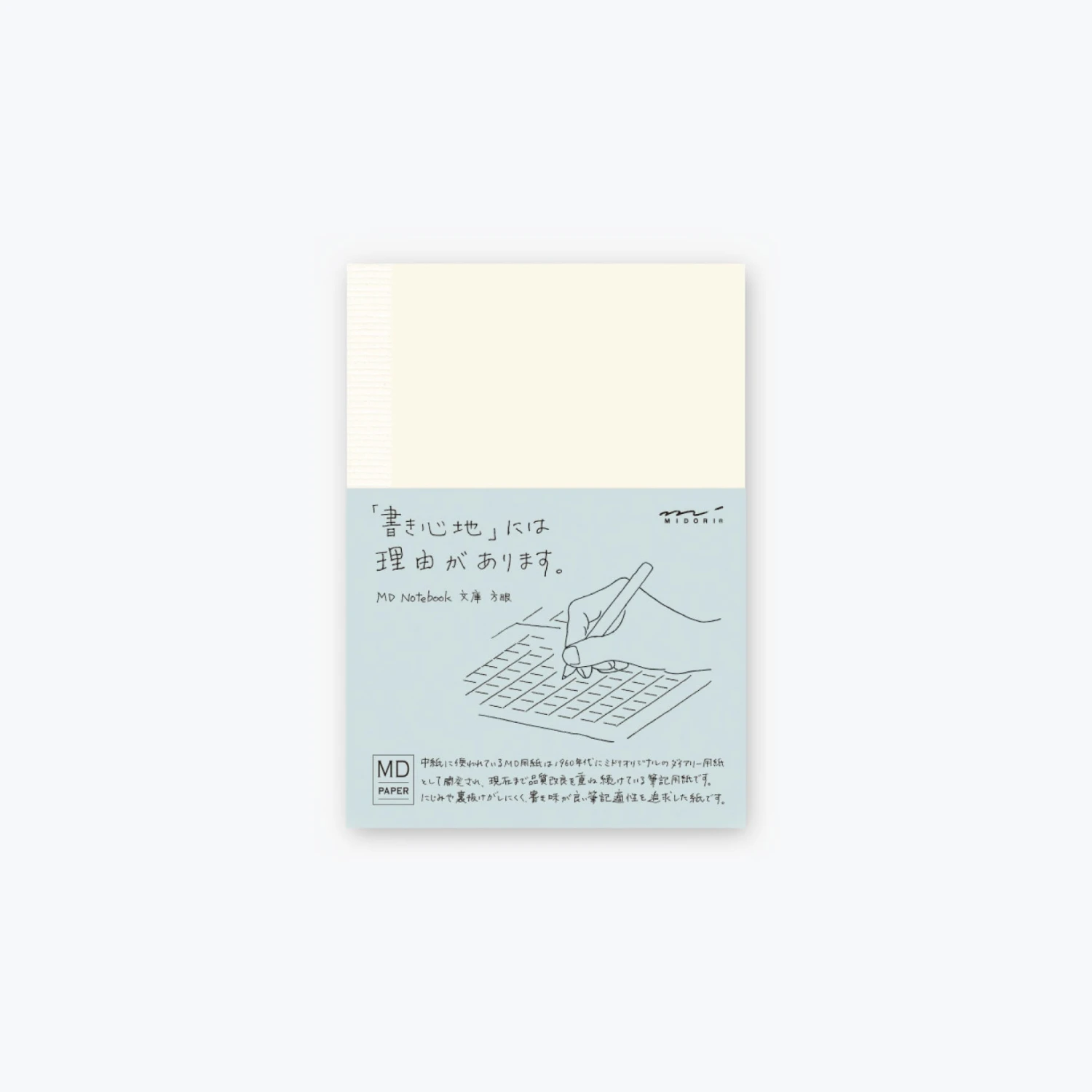 The grid notebook has 5mm squares with gaps in between, like the old genko yoshi used for writing in Japan. Every 5 and 10 squares are marked, making it easy to count how many characters are written, and the lines of the grid are pale blue so that they do not interfere with writing or sketches.