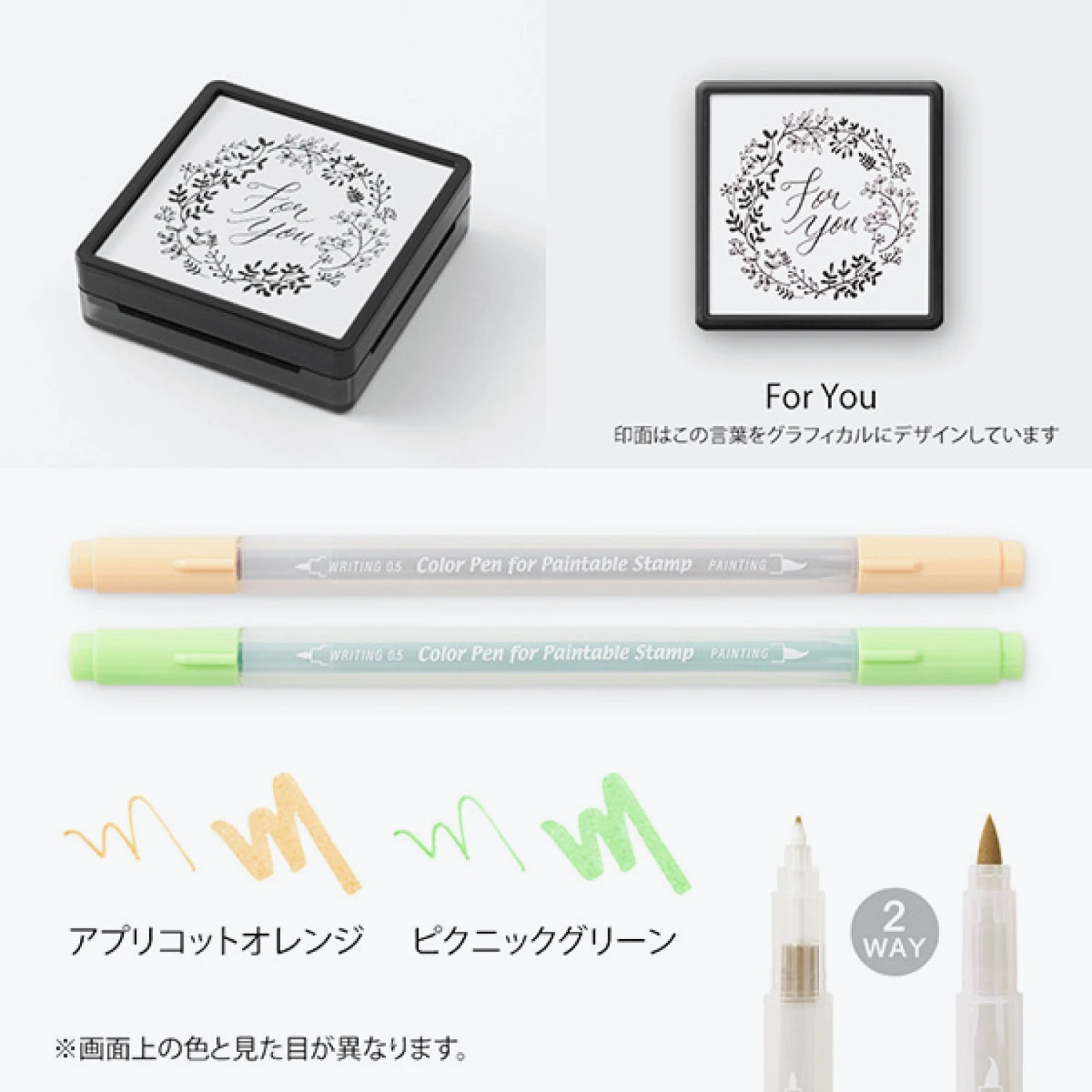 The calligraphy pattern on the stamp was designed by popular artist Mikiko Amemiya, which can be coloured in with the two pens that contain a brush tip end on one side and a fineliner on the other. The self-inking stamp makes about 1,000 impressions before requiring the black ink to be topped up using the Midori ink refill. To use, simply remove the cap and hold it with both hands so that it is parallel to the desk. The Midori self inking stamps can also be used for journaling, decorating or with the Midori sticky notes or stamp series notebook.