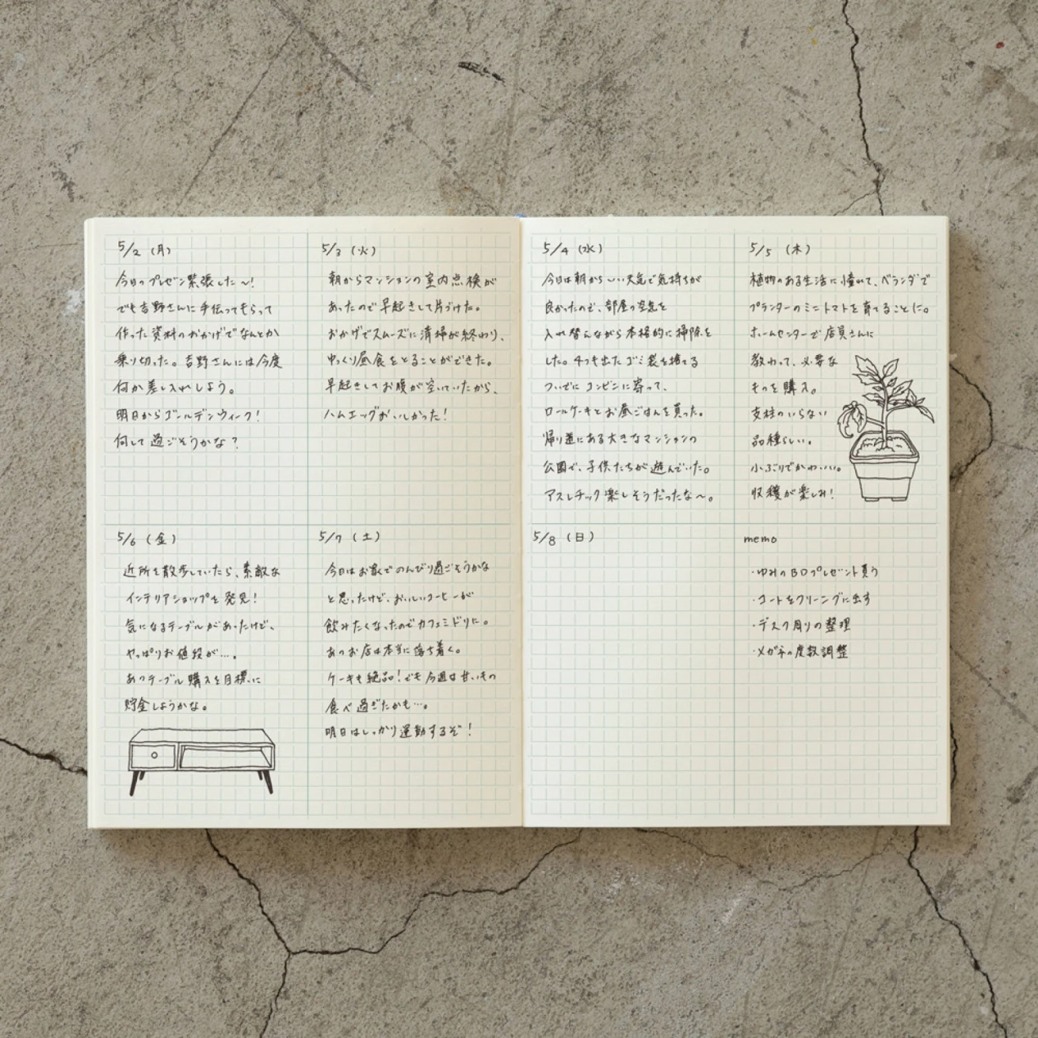 The Midori Notebook comes with 176 pages of MD Paper, which is smooth and resistant to feathering and show through, making it ideal for all writing instruments including fountain pens. The grid block notebook uses bold lines to divide each page into four segments, eight segments across two pages.