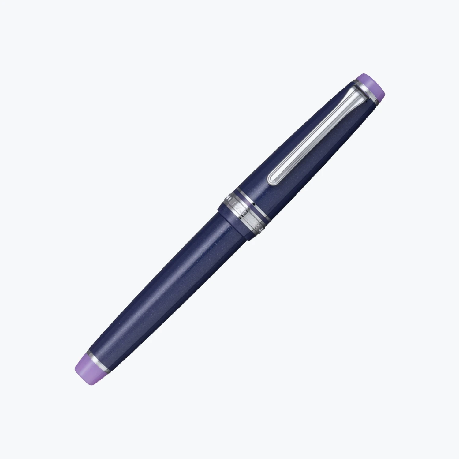 The Sailor Storm Over the Ocean is a limited edition ProGear Slim fountain pen that features a metashine navy barrel and cap, complemented by silver-plated accents. The contrasting purple coloured end cap features the Sailor anchor logo.