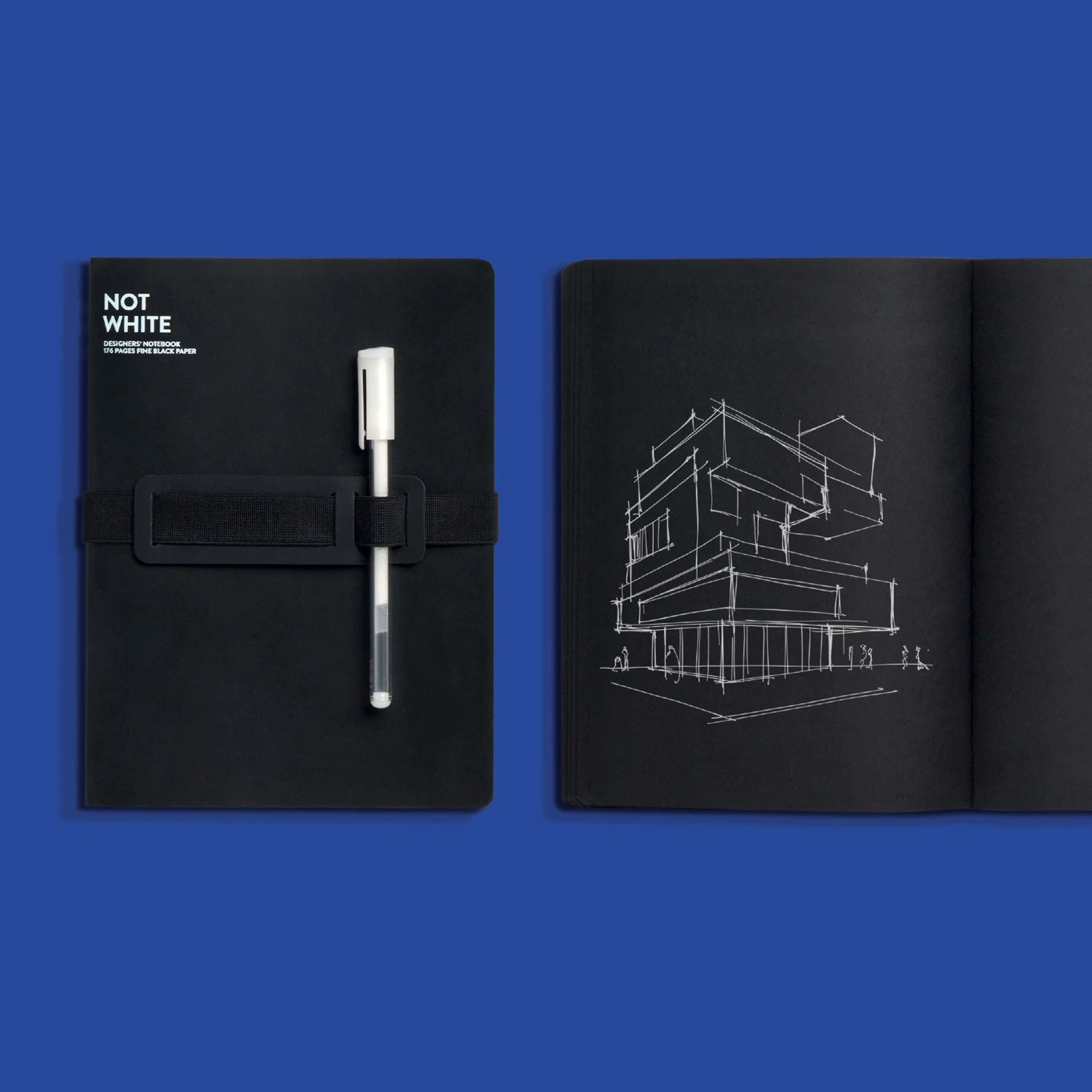 The Nuuna Not White notebook contains 256 pages of black paper and includes a white gel pen along with an elastic band that can hold a pen and phone to keep the notebook closed securely.