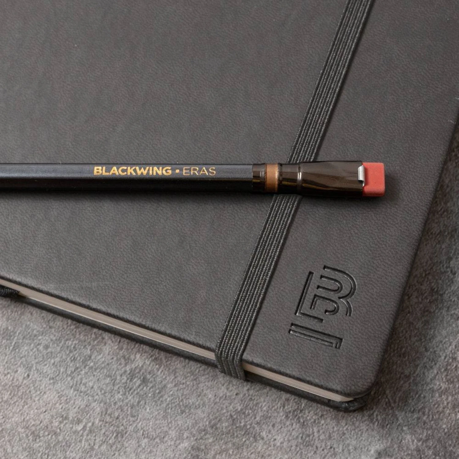 The Blackwing Eras Slate Notebook is a limited edition notebook to celebrate the 10th anniversary of Blackwing’s revival. It feature’s Blackwing’s signature lay-flat binding and pencil holster that comes with a Blackwing Eras pencil, which is inspired by some of the earliest Blackwings ever produced. Each A5 notebook also features a dark grey matte cover and gold ribbon to compliment the pencil, and contains 160 pages of 100 GSM dot-grid paper.Â