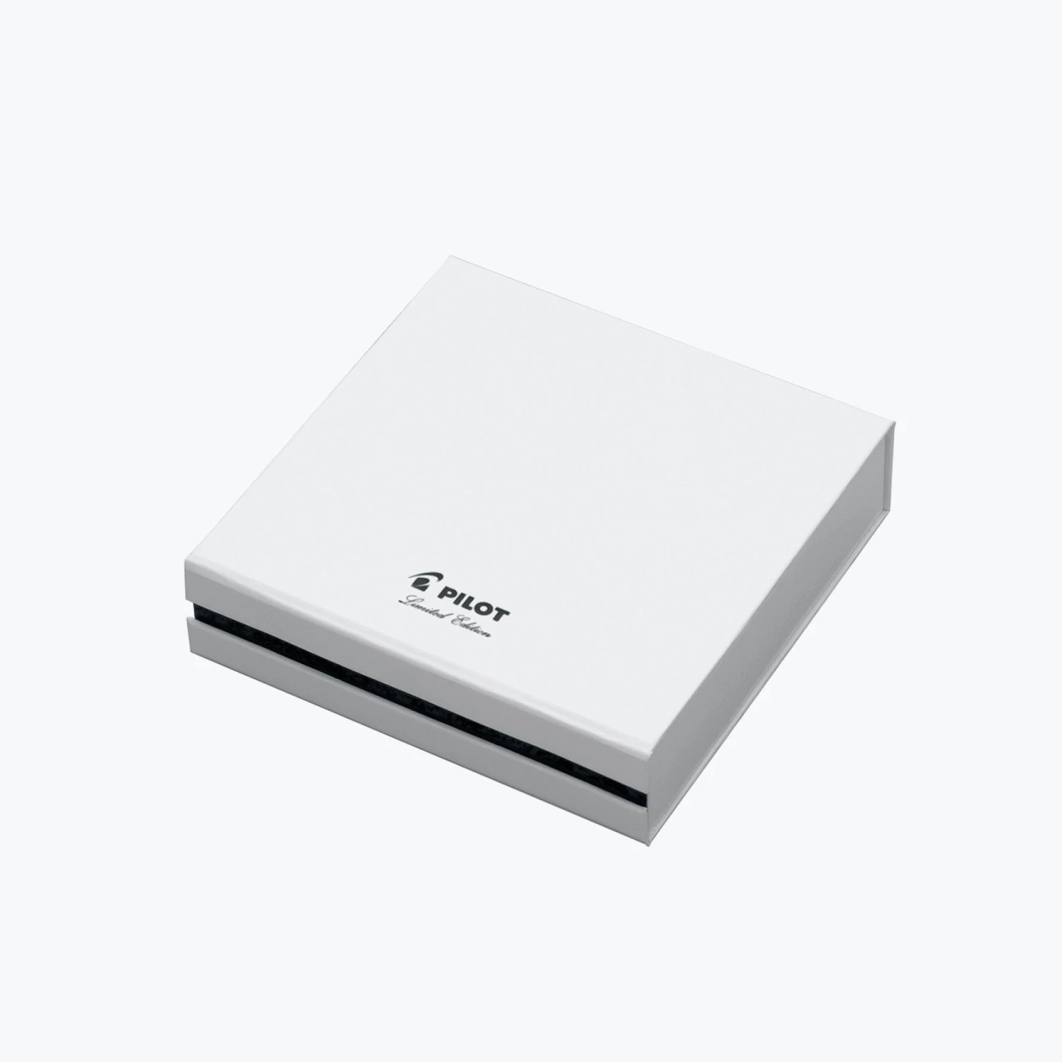 The Pilot 2021 Limited Edition Capless (Vanishing Point) Black Ice fountain pen features matte black accents and an 18K gold black ion coated nib. Presented in a square, white premium box with a drawer to hold the cartridges. Converter-40 included inside the pen.