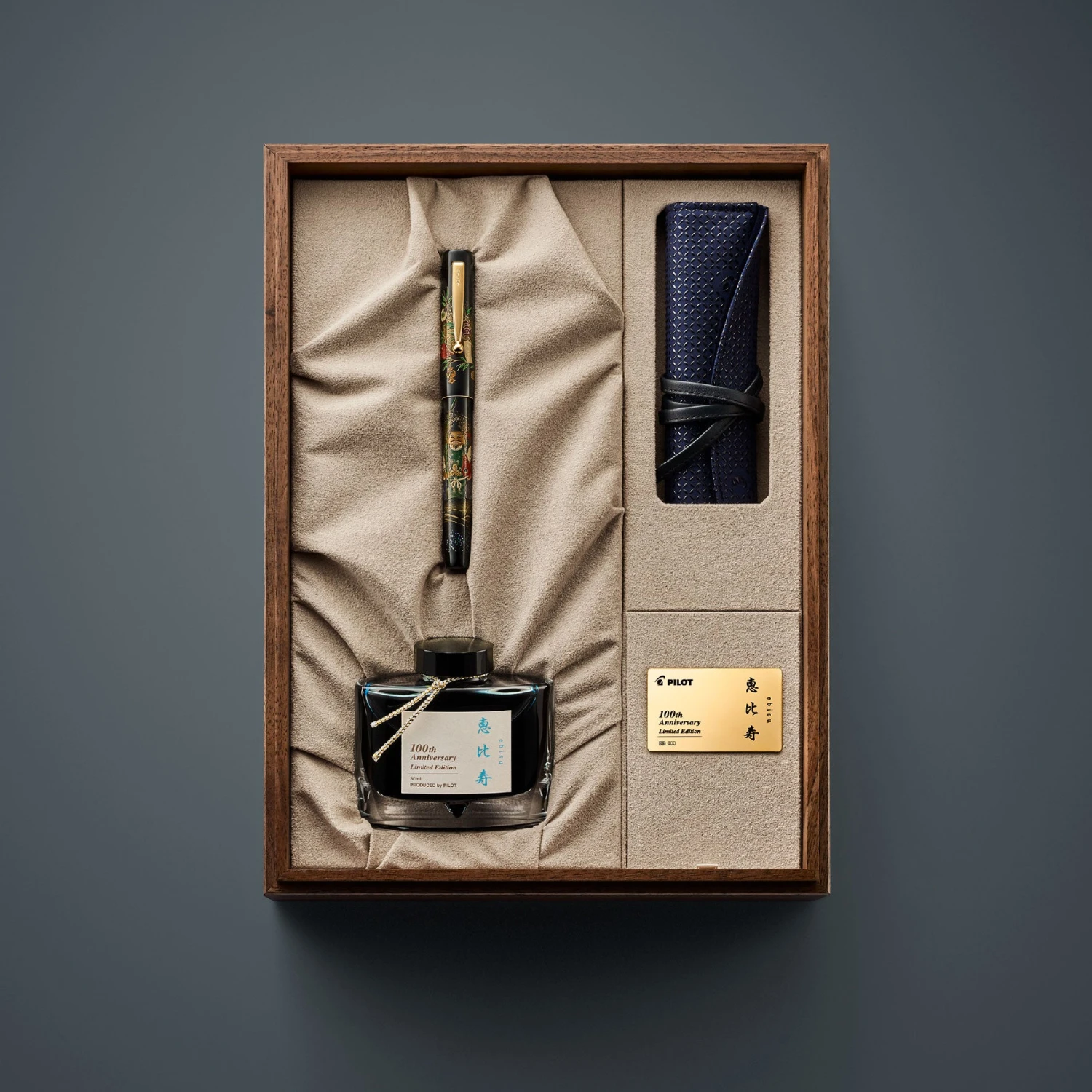 It comes individually packaged in an exclusive wooden box with laser engraving. Alongside with the pen, it has a matching 50ml limited edition ink, a leather pen wrap (inden), PILOT ink cartridges (6pcs in black), use and care guide, leaflet, Maki-e signature artist card, navy cloth and serial number plate.
