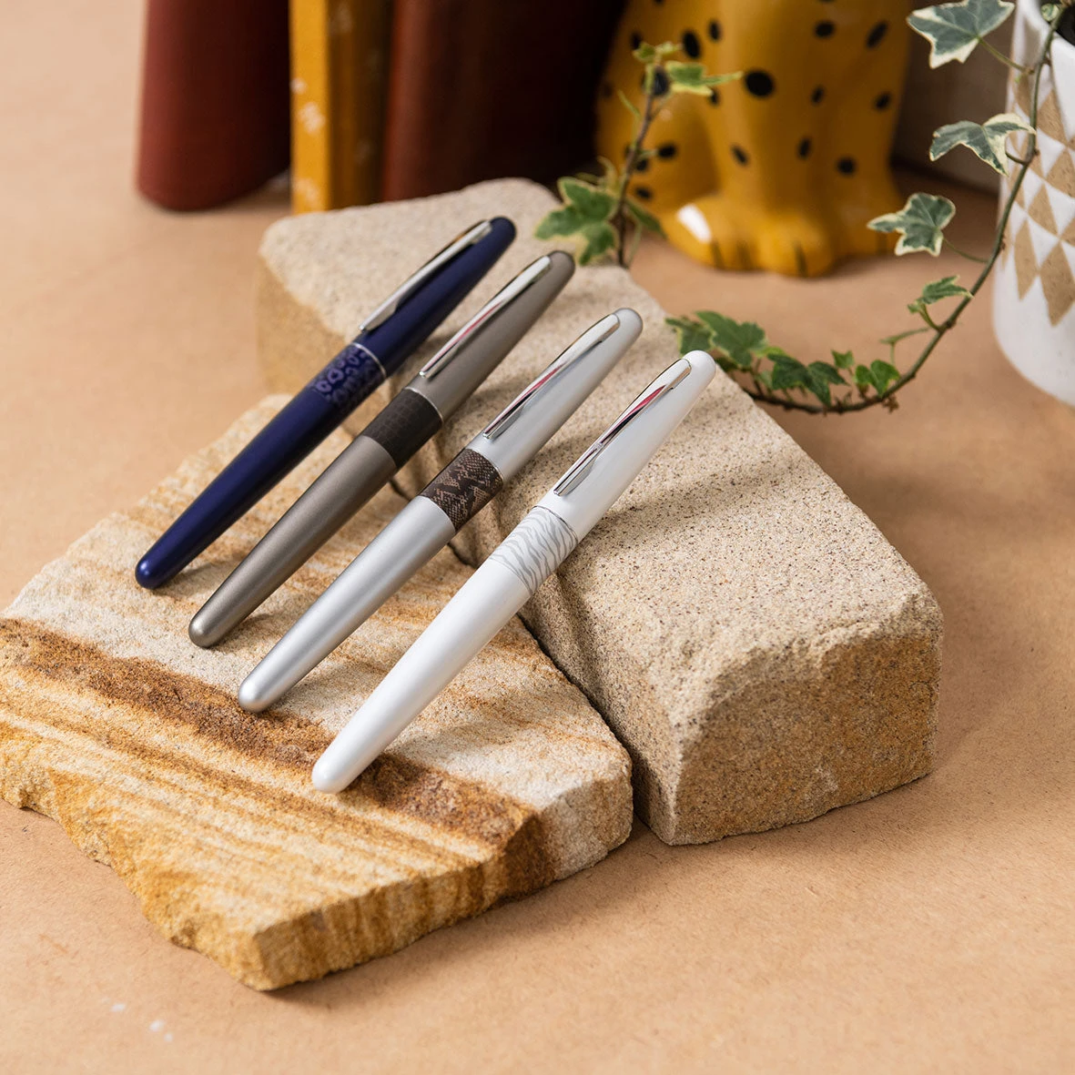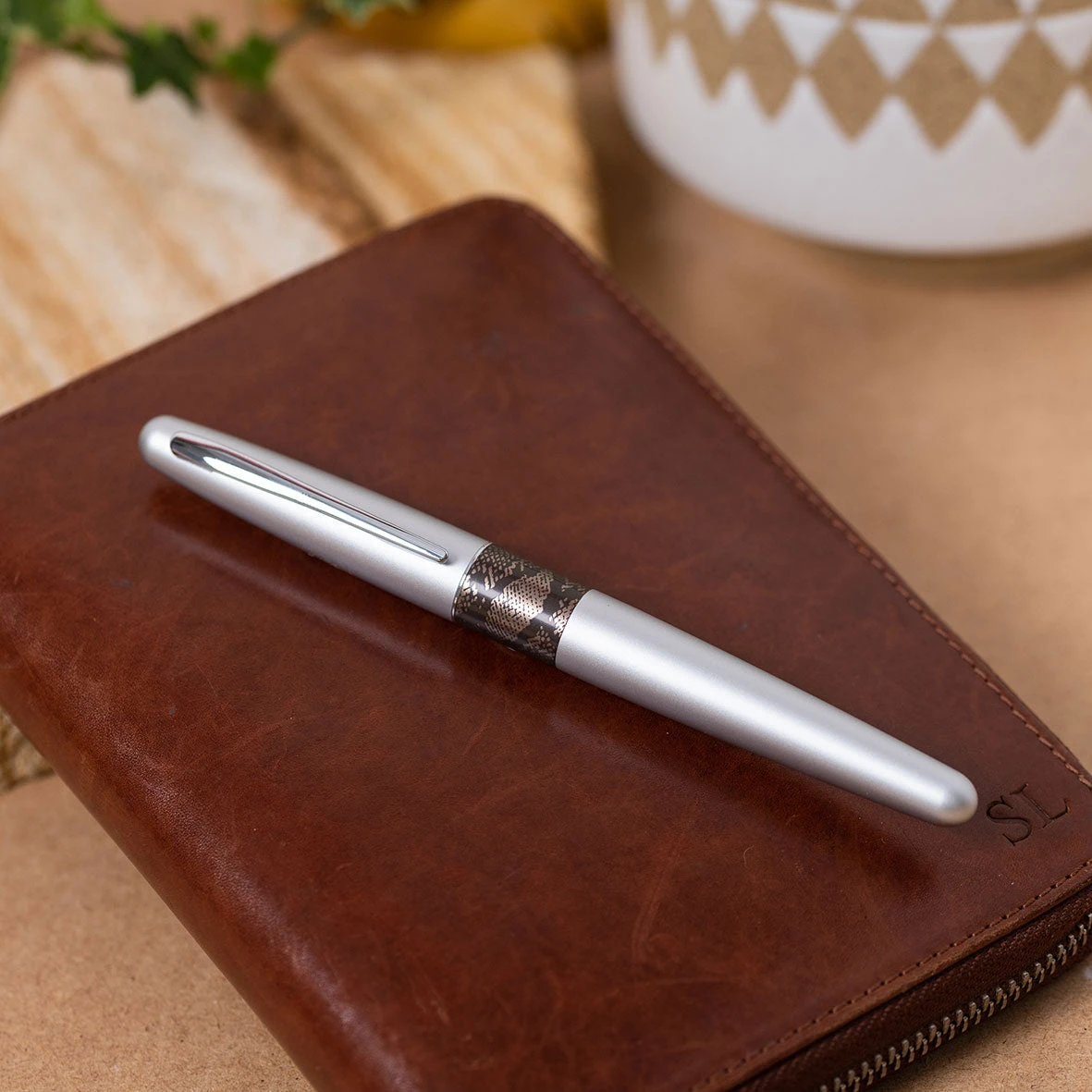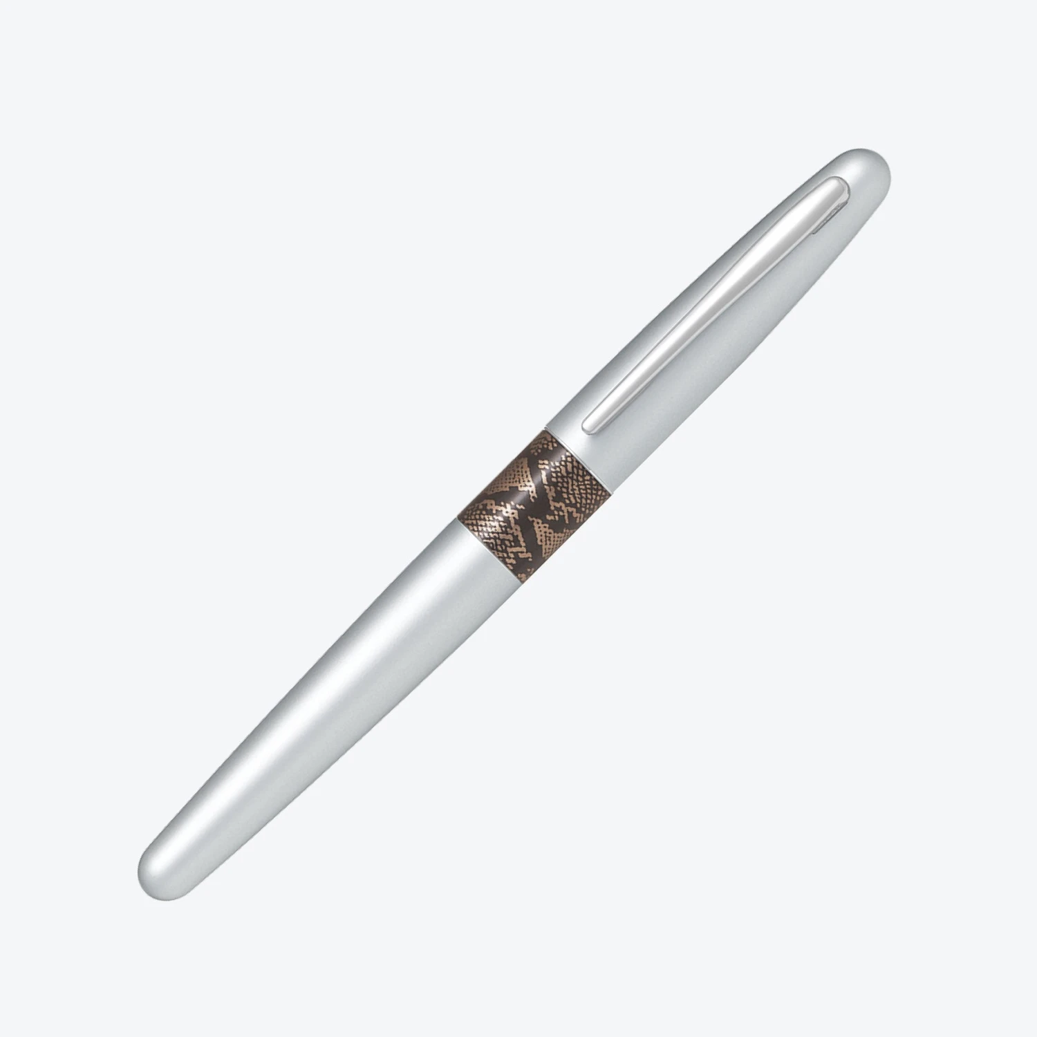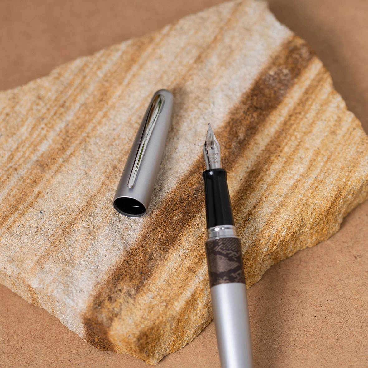 The Pilot Metropolitan is an all round fountain pen – it is stylish, well made and great value for money, making it the perfect everyday or beginner pen. This silver metal bodied pen has a python pattern accent band, silver trim and a quality steel nib that is known for its smoothness.Â
