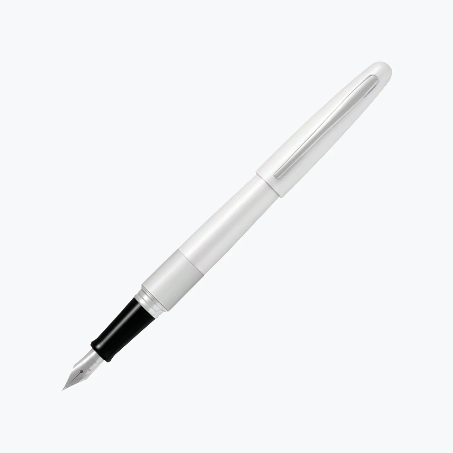 The white Pilot Cocoon is a sleek shaped fountain pen with a quality steel nib that is known for its smoothness, making it perfect for everyday use or beginners. The metal body features a stylish matte finish over a brass barrel with chrome accents. The band near the cap has a glossiness that is reserved and creates a subtle distinction from the rest of the body.
