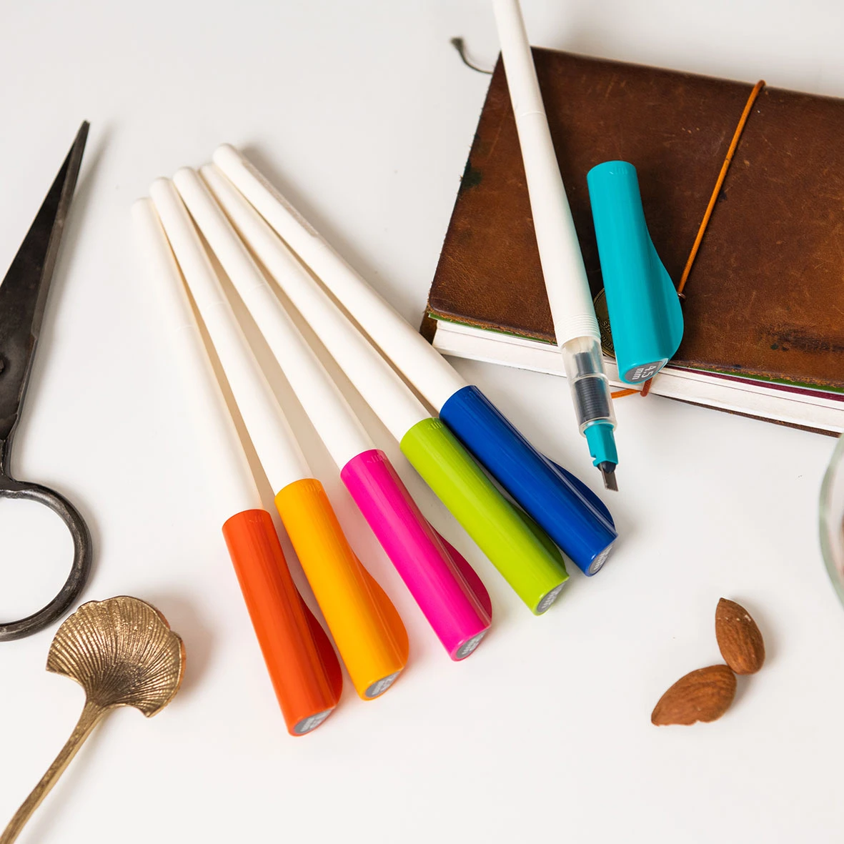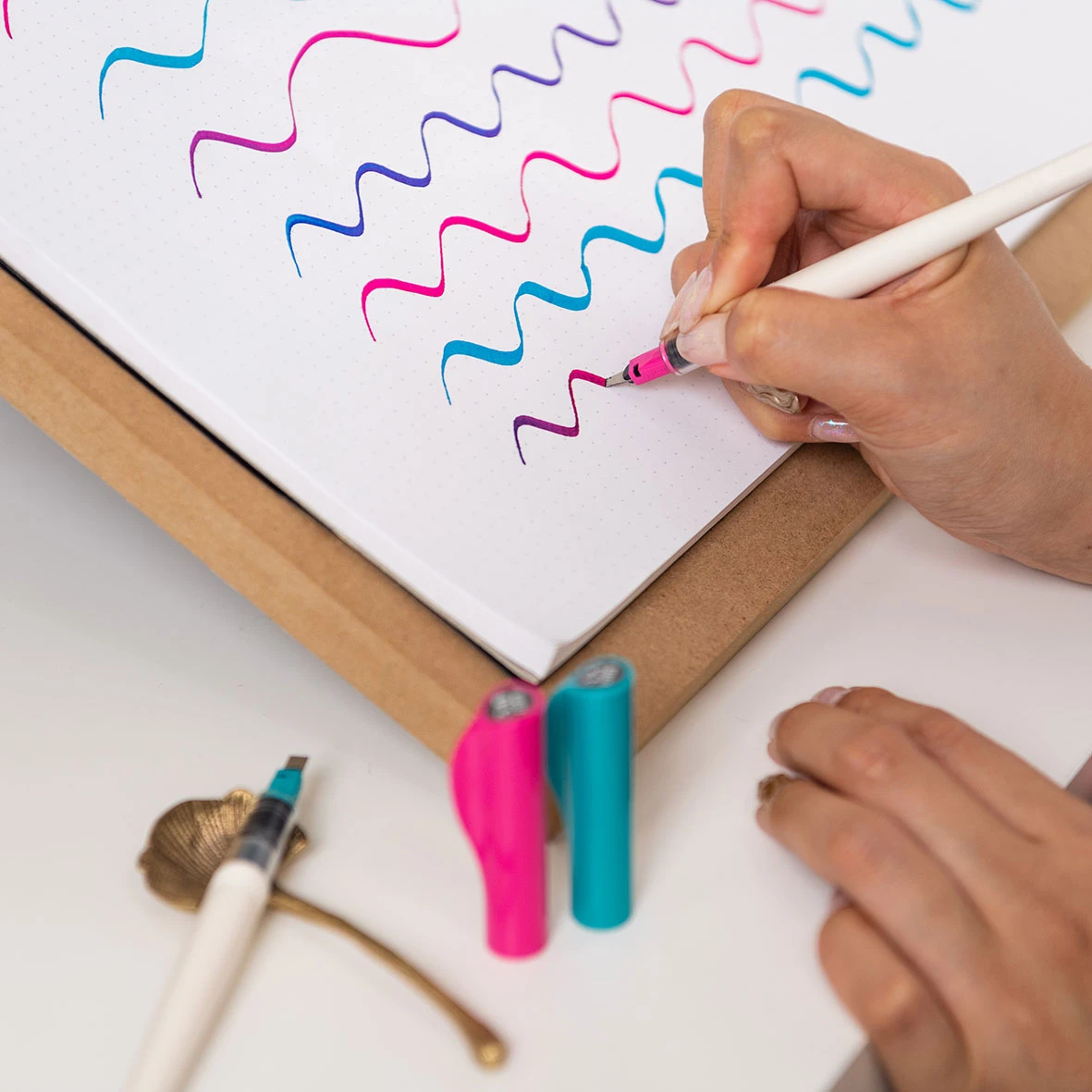 The unique, two-plate design allows the ink to flow evenly along the entire width of the nib so you can use both the flat edge for broad strokes and the corner for narrow lines. You can also use two Parallel Pens to blend between colours by touching the tips together for a few seconds. The ink will flow from one pen to the other, creating a gradient effect when writing.Â