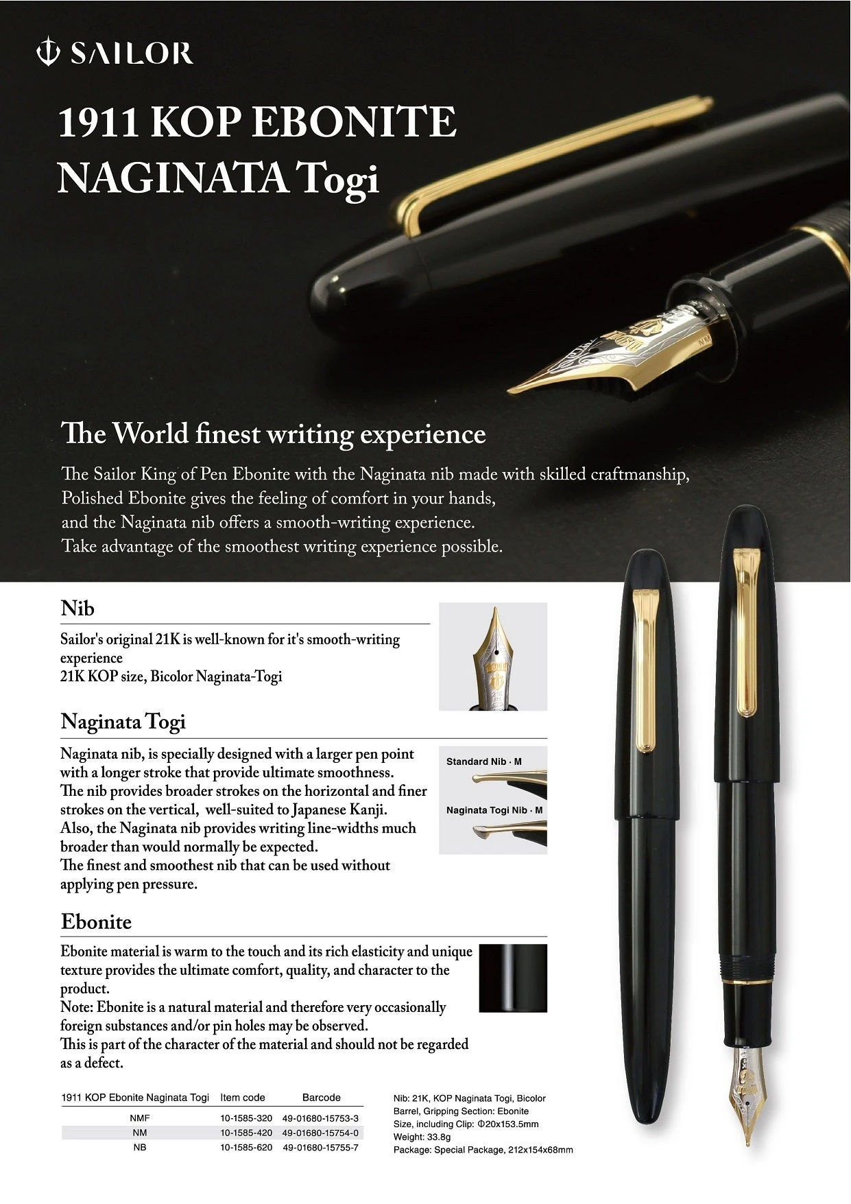 The Sailor King of Pen Black Ebonite with gold trim is a study in streamlined style and simplicity. Handcrafted ebonite hard rubber and Sailor 21k nibs combine to create a unique and truely beautiful pen. Now this classic pen is available with a 21k two-tone Naginata Togi nib.