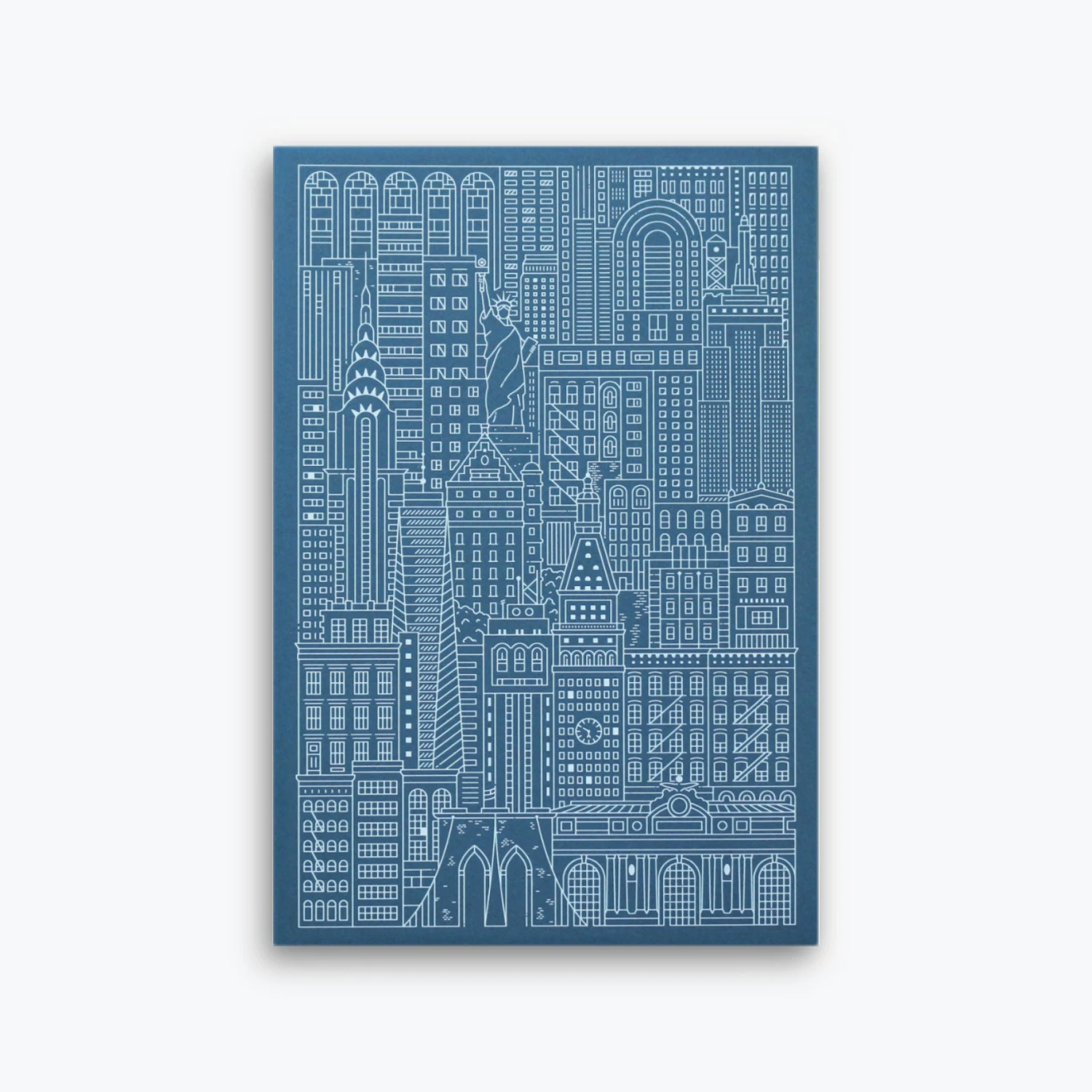 The tall island city of New York is inscribed into this high-quality notebook. The blue cover features iconic landmarks including the Statue of Liberty, Brooklyn Bridge and the Empire State Building – how many can you find?