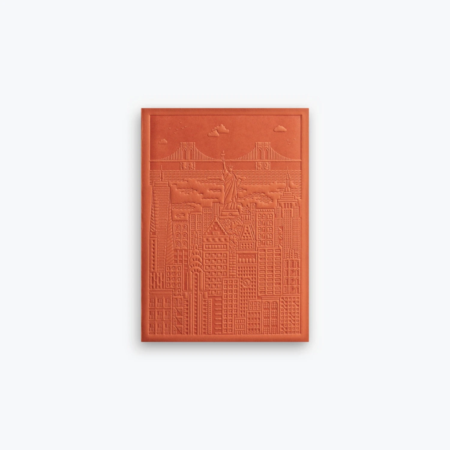 The tall island city of New York is inscribed into this high-quality notebook. The rust cover features iconic landmarks including the Statue of Liberty, Brooklyn Bridge and the Empire State Building – how many can you find?