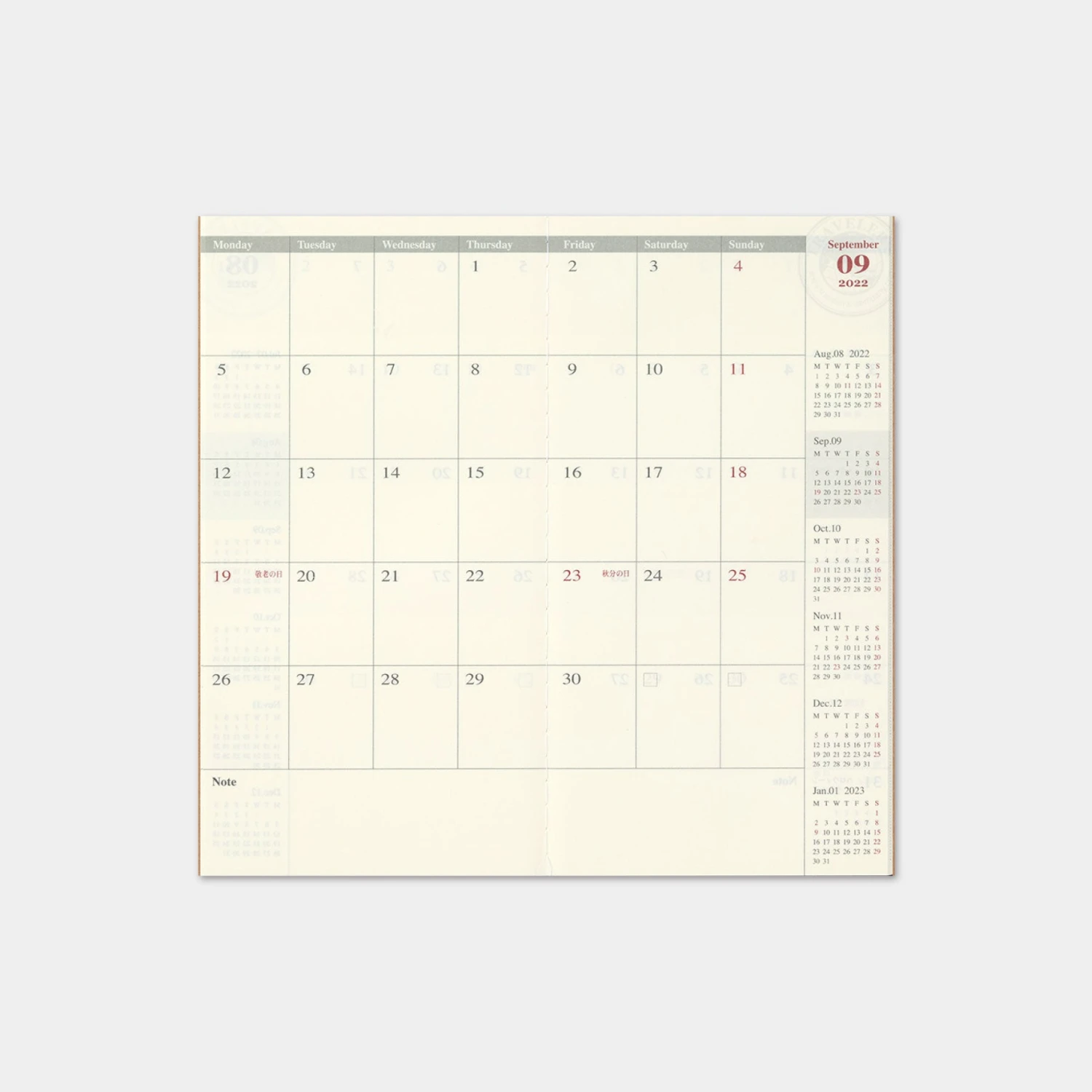 The Traveler’s Company 2022 diary (monthly) is a regular size insert for the Traveler’s Notebook and features a calendar style layout (one full month on two pages) with boxes for each day and note taking space at the bottom. In the right column, the previous month and 4 subsequent months are printed for a quick overview of the months ahead.